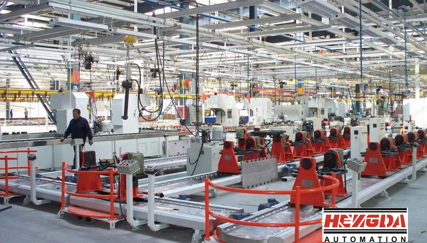車橋裝配線一般包括主動錐齒輪帶軸承座總成裝配線、差速器總成裝配線、主減速器總成裝配線、軸間差速器裝配支線、驅(qū)動橋總成及工字前橋裝配線、輪轂支線、輪邊支線等組成。
