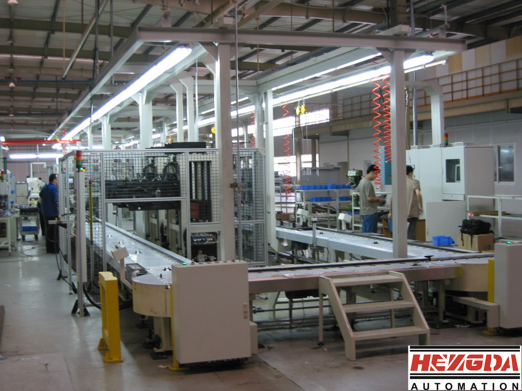 隨著汽車工業的發展,發動機裝配線 的自動化程度越來越高,發動機裝配線主要由活塞連桿分裝線、缸蓋分裝線、總成裝配線組成。具體的設備大致包括:摩擦輸送線、托盤、打號機、激光標簽打印機、翻轉機、缸孔噴油裝置、活塞插入輔助裝置、曲軸分組號攝像識別裝置、主軸瓦選配裝置、氣門插入翻轉臺、氣門拍打裝置、活塞銷壓裝機、潤滑油噴嘴壓裝及檢測機、氣門油封壓裝機、缸蓋水管接頭壓裝機、火花塞導管壓裝機、主軸承蓋螺栓擰緊機、連桿螺栓擰緊機、缸蓋螺栓擰緊機、凸輪軸蓋螺栓擰緊機、正時鏈蓋擰緊機、油底殼擰緊機、曲軸皮帶輪螺栓擰緊機、主軸承蓋螺栓松開機、連桿螺栓旋松機、總線控制系統與信息管理系統、裝配線工具、量檢具、通用料架、智能料架、冷試臺架、機械挺柱選配裝置、氣門鎖夾壓裝機、涂膠及機油加注設備、泄漏檢測設備、曲軸端隙及扭矩測量裝置、曲軸回轉力矩檢測+油道試漏、MPI試漏機、缸蓋泄漏試驗機、長缸油路試漏機、長缸水路試漏機。
